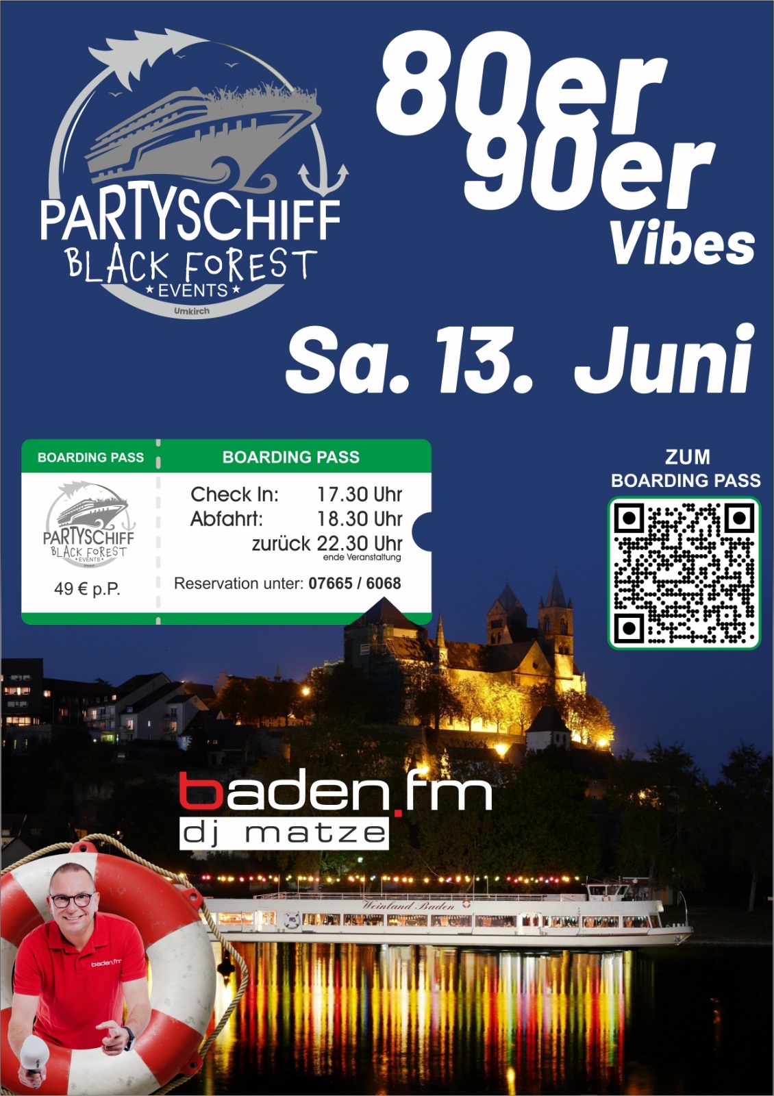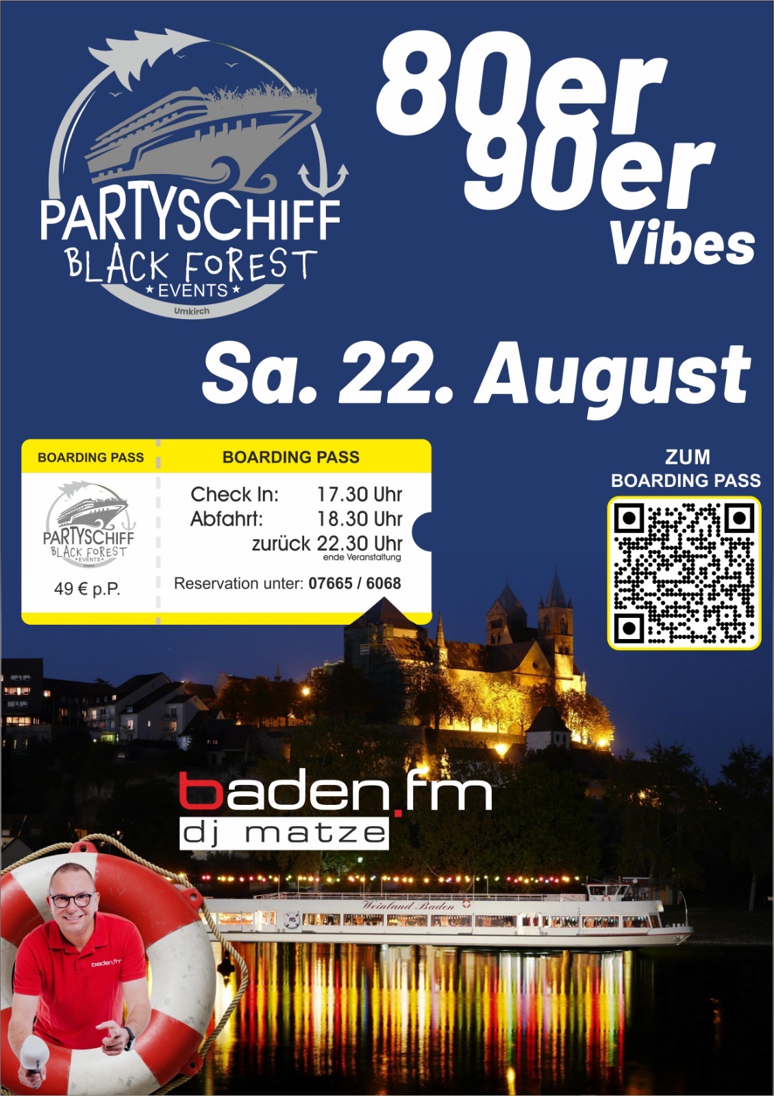 Breisacher Fahrgast Schiffahrt Rheinuferstraße 99, Breisach, Baden-Württemberg, Germany- 80er & 90er VIBES – DIE RHEINPARTY AB BREISACH - Erlebe eine besondere Party auf dem Rhein: Ab Breisach geht es 4 Stunden lang mit dem Schiff durch die Abendstimmung – begleitet von guter Musik, entspannten Leuten und echter Feierlaune. - Baden FM DJ Matze sorgt für den Soundtrack des Abends: Die besten 80er-…